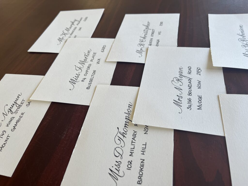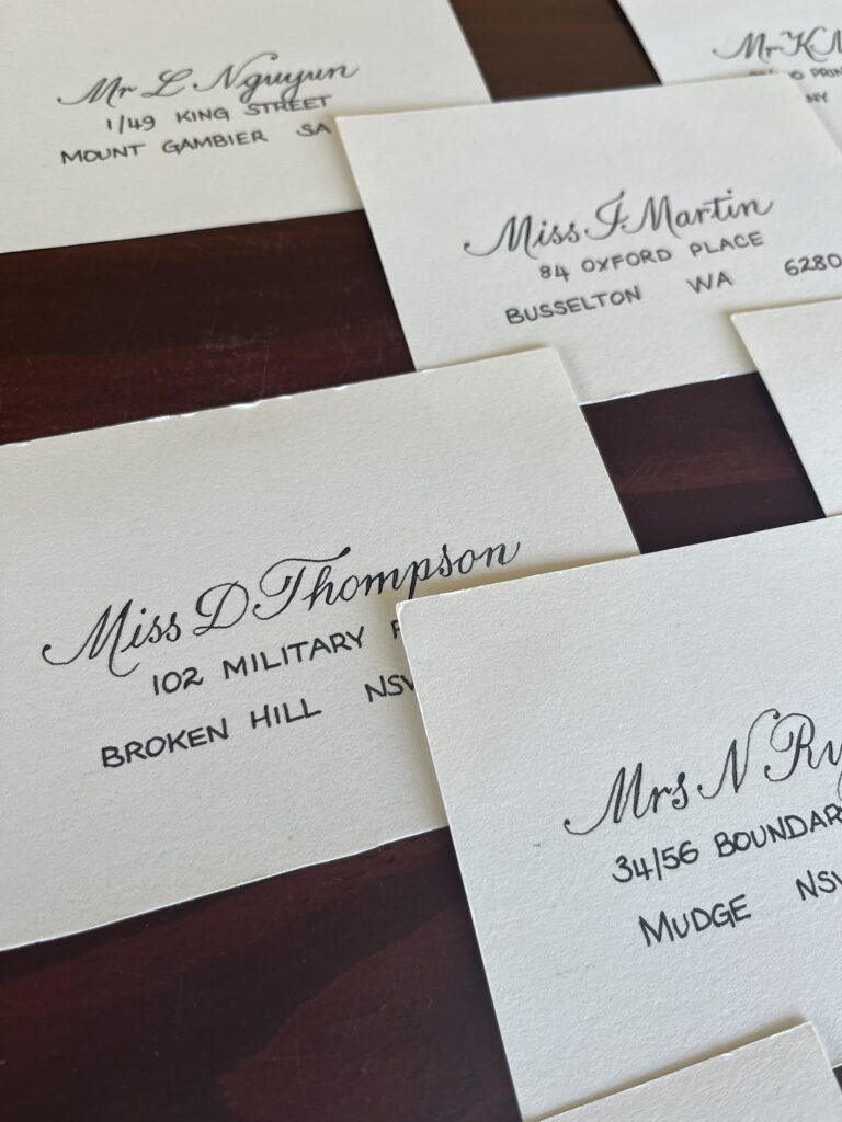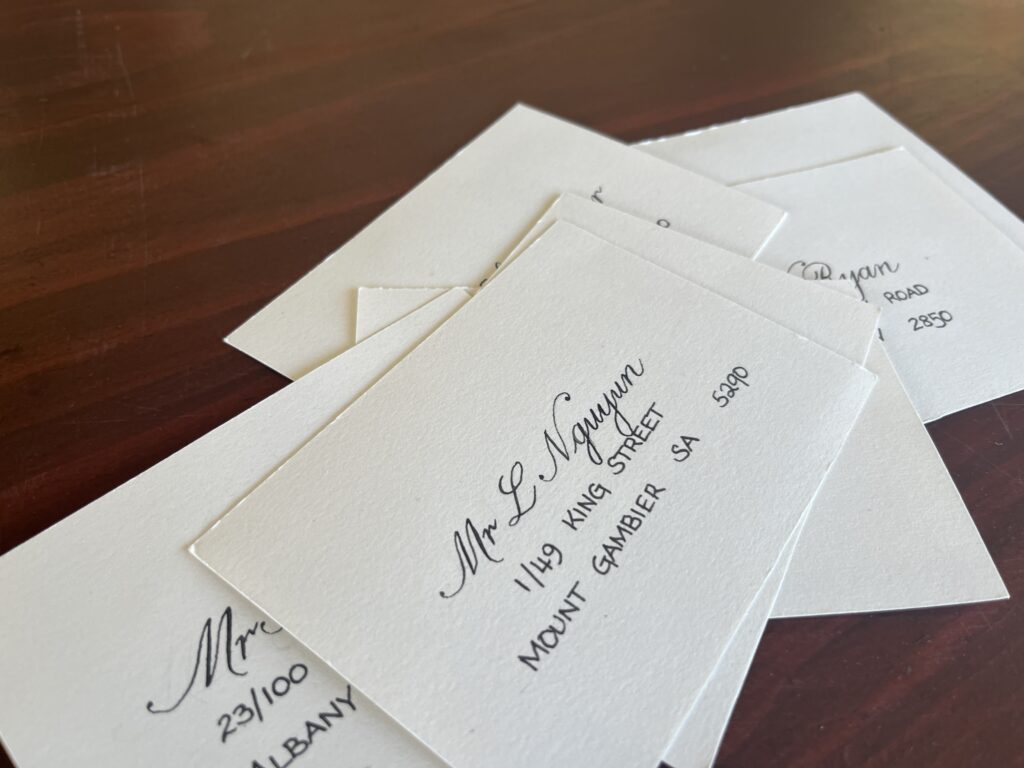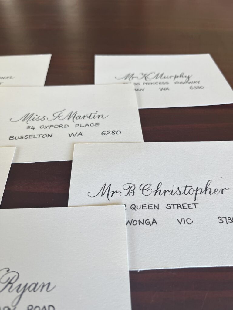 Portfolio photography is an important part of showing calligraphy professionally. Each image gives a window into the work, highlighting the care, detail, and artistry in every piece. From envelopes and placecards to finished projects, good photographs let viewers see the flow and texture of the letters.